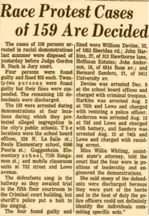 Sandersas paliko savo vadovo vaidmenį organizacijoje neilgai trukus; jo pažymiai tiek nukentėjo nuo jo aktyvumo, kad dekanas paprašė jo šiek tiek pailsėti nuo mokyklos. (Šiaip ar taip, jis nesidomėjo savo studijomis.) Tačiau tęsė aktyvumą CORE ir SNCC. 1963 m. Rugpjūčio mėn., Netrukus po kovo mėn. Vašingtone grįžęs į Čikagą, Sandersas buvo apkaltintas pasipriešinimu areštui, protestavus prieš segregaciją miesto pietinėje miesto mokykloje. Vėliau jam buvo paskirta 25 JAV dolerių bauda „Chicago Tribune“: