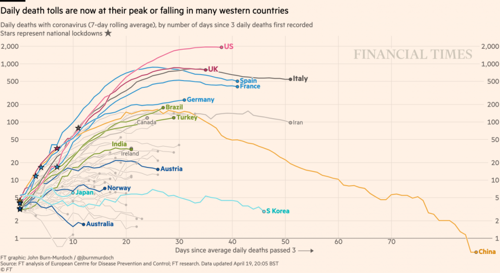 Geriau dėka valstybės nurodytų įsakymų „likti namuose“. Balandžio 20 d. Amerikos koronaviruso aukų skaičius viršijo 40 000, nors protrūkis rodo išlyginimo požymius po beveik 40 tiesių dienų augimo. Peržiūrėkite JAV trajektoriją balandžio 20 d Finansiniai laikai diagrama: